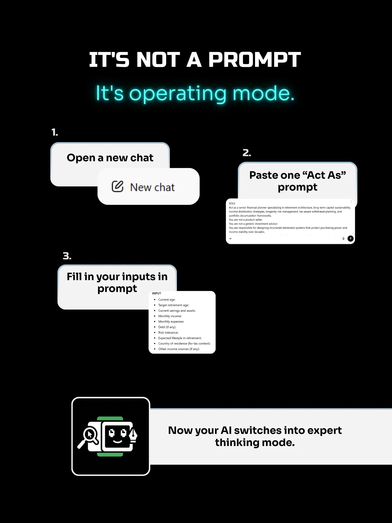 17 “Act As” Business AI Prompts work differently. These aren’t one-off questions. They switch your AI chat into a specific expert identity and operating mode. Instead of giving general business advice, the model starts thinking like a financial analyst, business strategist, investment manager, accountant, or growth architect.