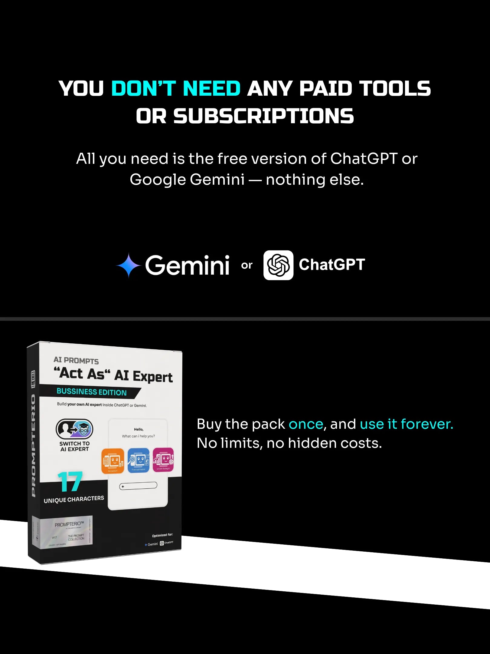 This is a one-time purchase. There are no recurring fees or hidden monthly subscriptions. Once you buy an "Act As" prompt, you own it for life. You can save it, reuse it across different projects, and apply it to as many new chats as you need. Think of it as a permanent addition to your professional toolkit.