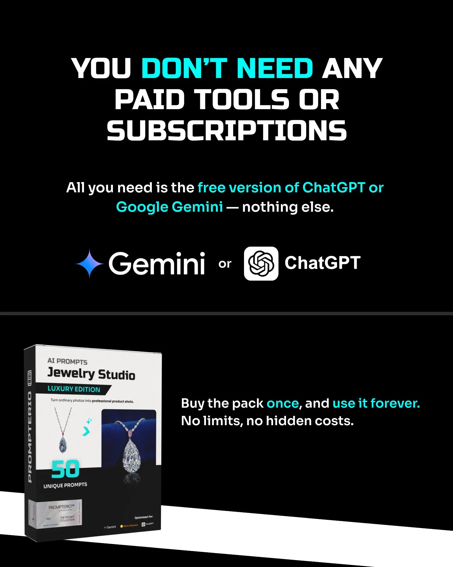 ![50 Luxury Jewelry: Studio [Mockup] AI Prompts](http://prompterio.com/cdn/shop/files/INFO_-_50_Luxury_Jewelry__Studio_9.webp?v=1770810500&width=1445)
