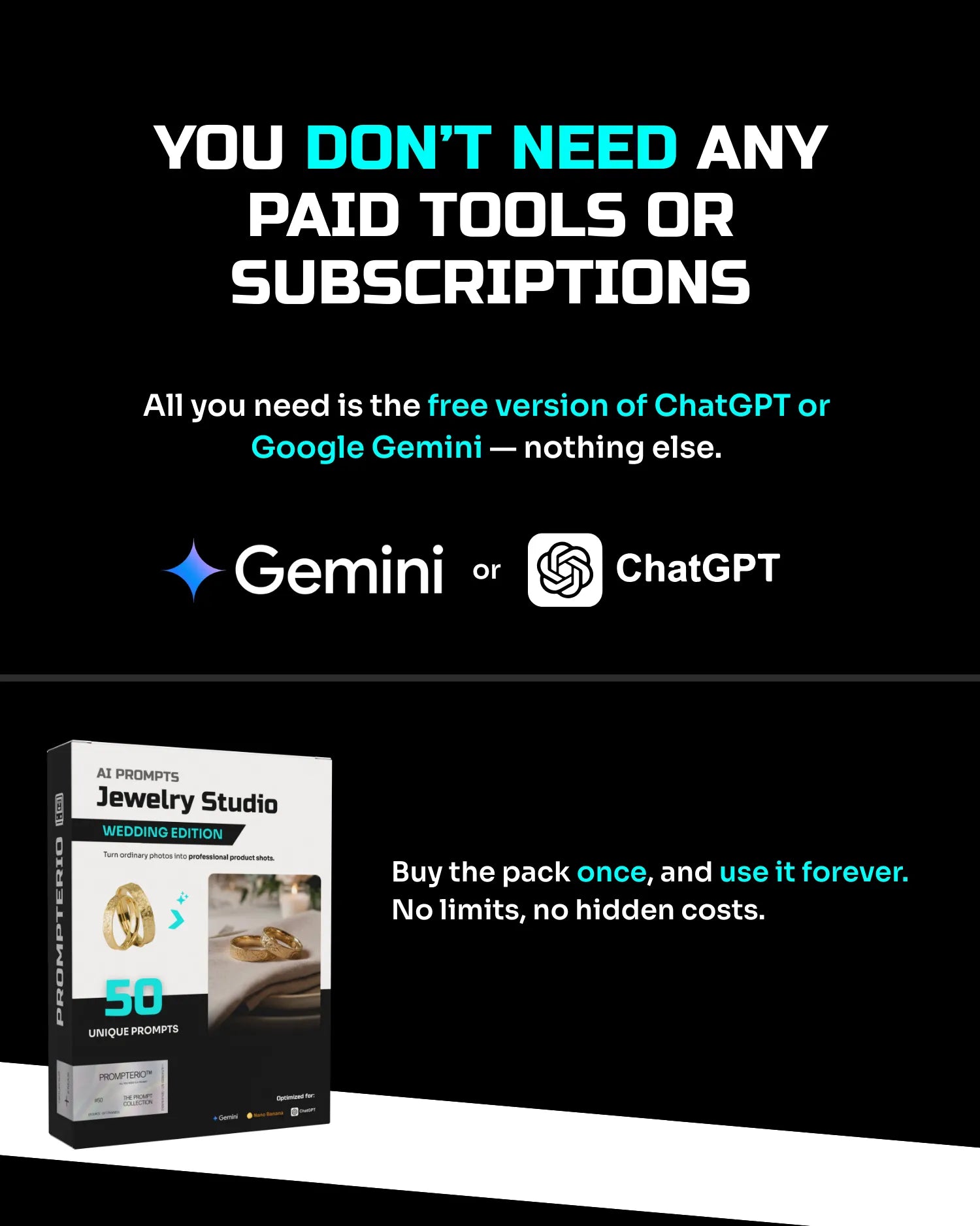 ![50 Wedding Jewelry: Studio [Mockup] AI Prompts](http://prompterio.com/cdn/shop/files/Info_-_50_Wedding_Jewelry__Studio_9.webp?v=1770808771&width=1445)