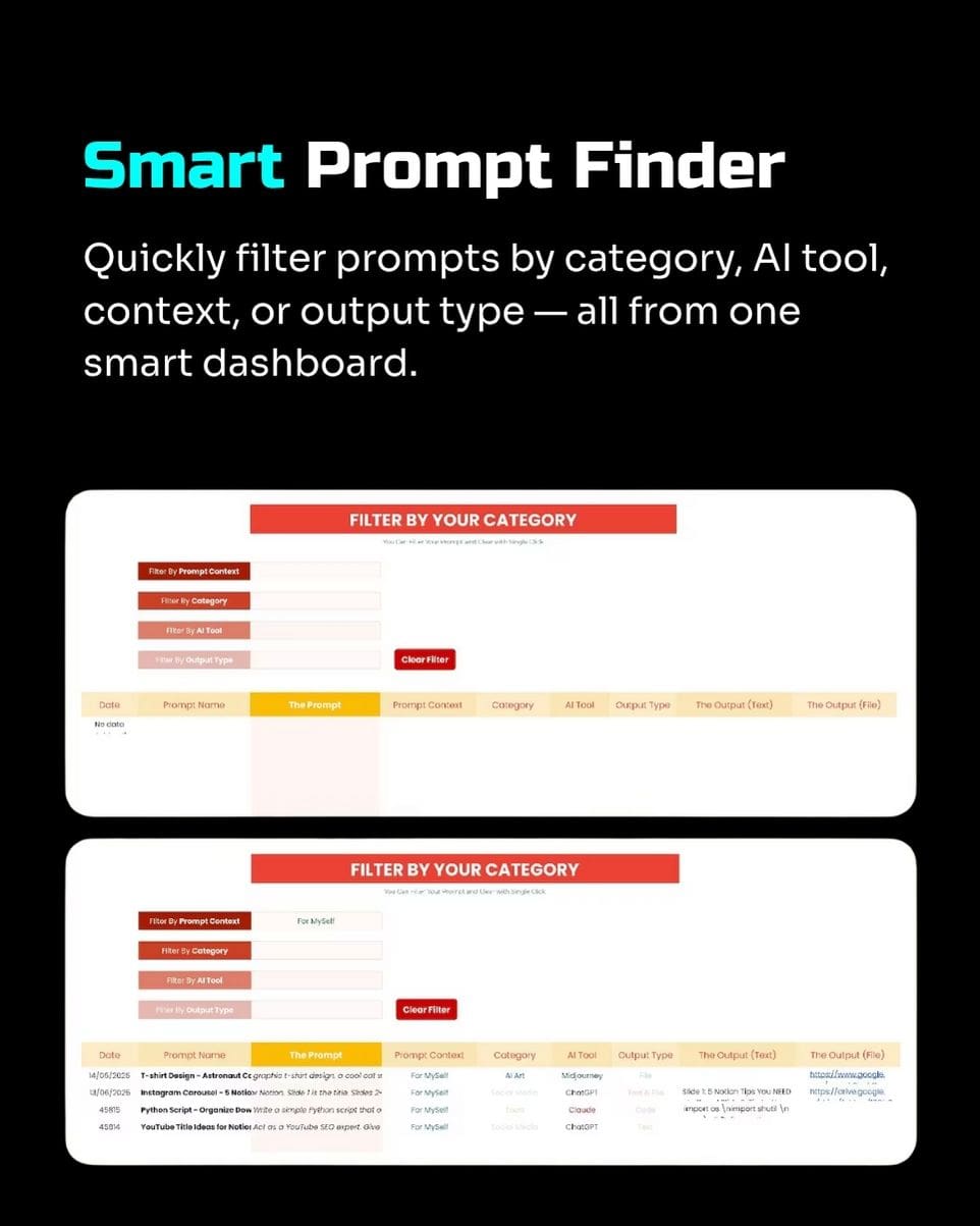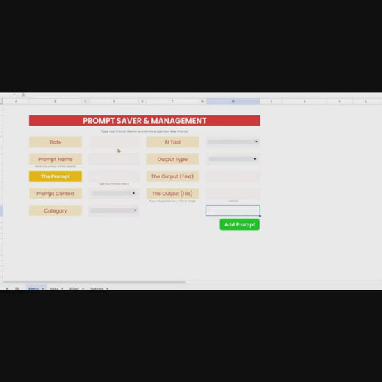 Not just a spreadsheet — a powerful system to organize, filter, and track your best AI prompts like a pro. Smart filters, status tracking & custom categories — everything you need to manage prompts like a high-performance creative team.